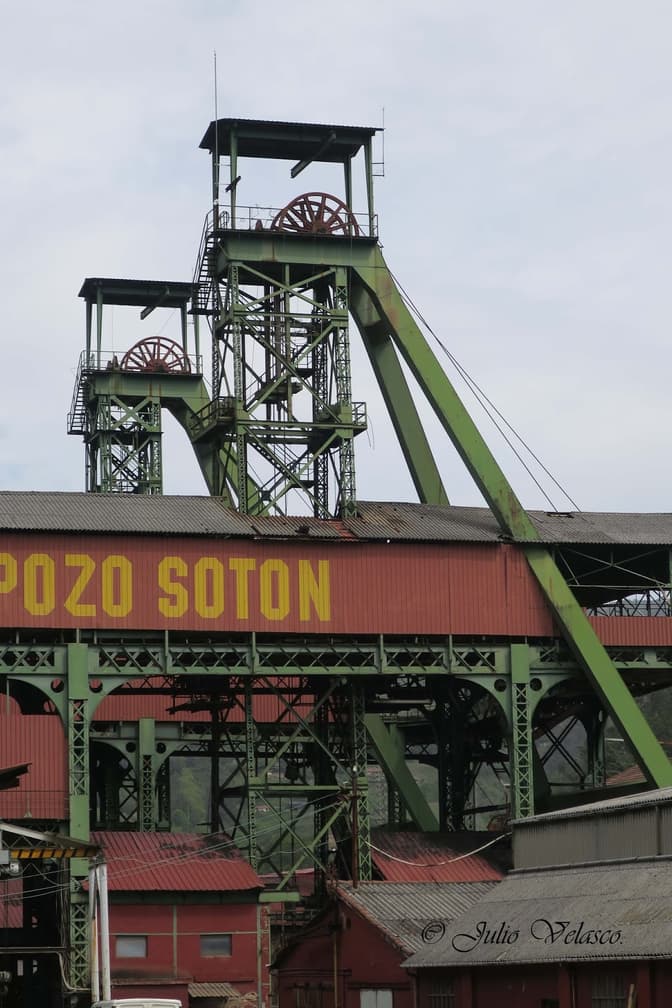 POZO SOTÖN: El Pozu Sotón, propiedad de la S. M. Duro Felguera, se comenzó a profundizar en 1914 pero hasta el año 1922 no alcanzó su total desarrollo. Planificado concienzudamente como explotación modelo, los primeros castilletes gemelos son de 1917 y presentan la particularidad de tener asociados y adosado en altura el taller de clasificación y embarque de carbones (reter). En 1985 fueron reformados y reforzados.